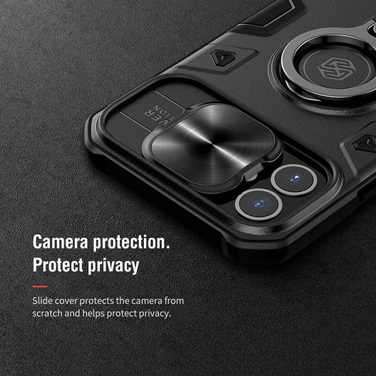 Case for Iphone 13 with Camera Cover & Kickstand, Camshield Armor Shockproof Impact-Resistant Case Protection Cover Built-In 360° Rotate Ring Stand (Black)